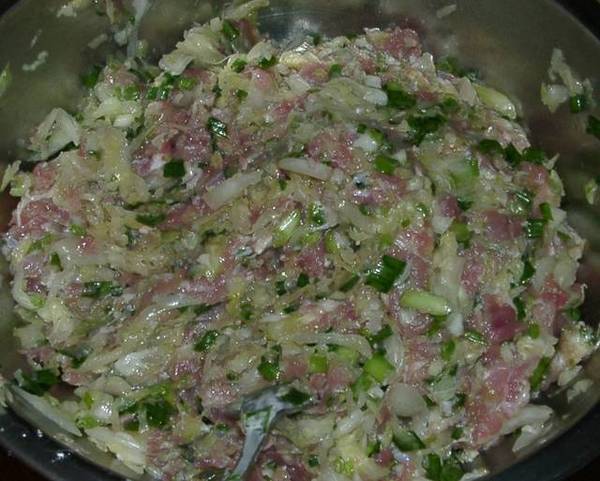 ↓ 最普通也最好吃的高麗菜餡 (鹽抓脫水的高麗菜+豬絞肉+蔥花+薑末+麻油)