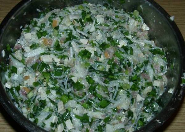 ↓ 韭菜餡 (韭菜+豬絞肉+蔥花+麻油+冬粉+山藥--哈~山藥擺著不知道要幹麻,加進去消耗掉)