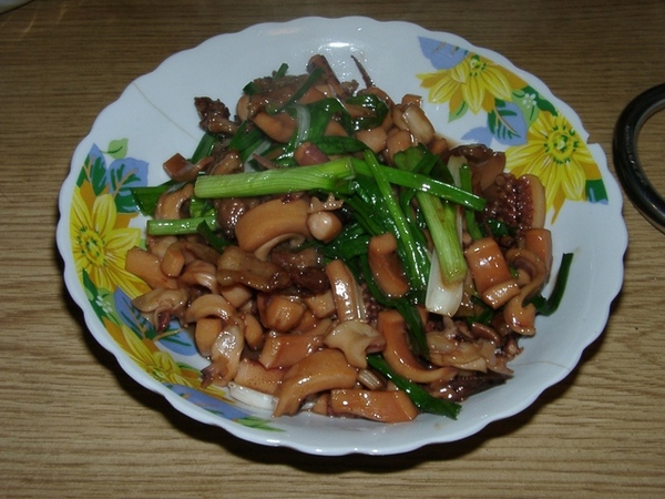 這道算是我家的經典菜色,材料很簡單,就只有魷魚、帶皮豬五花肉和蔥段。 我不曾吃過外頭賣的客家小炒,聽說有放芹菜和豆干。個人一直認為這是店家偷料省魷魚的伎倆。炒魷魚就炒魷魚,大方爽快點咩~