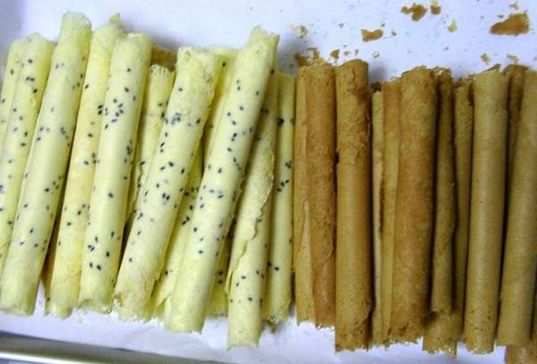 做吃的也是需要練習,第二批蛋捲果然品質和形狀都比較穩定。烤的時間不夠,蛋捲會不夠酥,烤的時間太長,還沒捲好就定型了(變餅乾),微妙啊~~