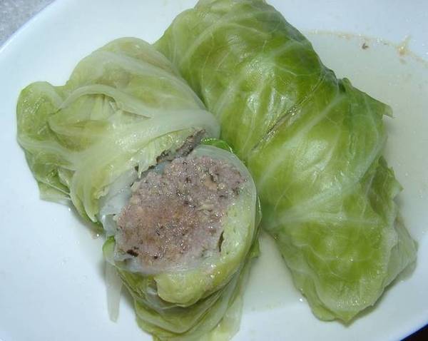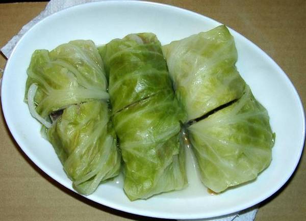 3. 菜葉攤開,放上剁好拌好的肉餡捲起,收口朝下放入盤中。