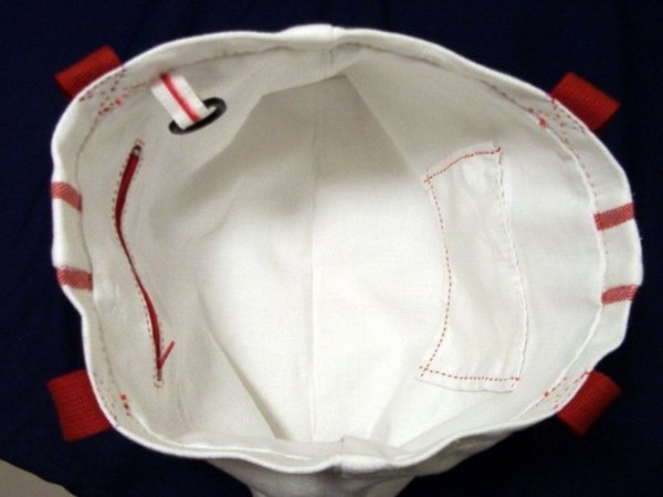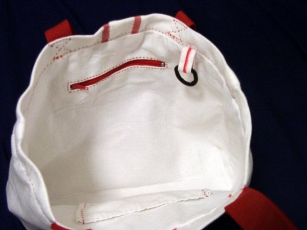 內裡是白色的棉布(同樣加上襯布),用紅色拉鍊做出暗袋,內部另一邊也有小口袋,另加上一個舊背包上剪下的扣環,可以掛鑰匙用。扣環連接袋身的那一小條布,是白棉布做的,白白的太無聊,所以用布用蠟筆畫上紅色線條。(布用蠟筆在台隆手創館有售,12色50元左右,好像也有水彩型的)搭配1吋寬紅色帆布織帶(提把),就完成囉~