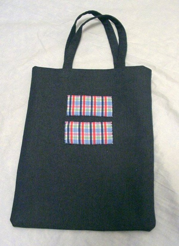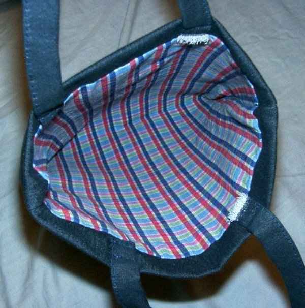 這個扁包也是比A4尺寸略小,表布和內裡用格子布都加了襯布,所以成品會比較挺。正面的貼布繡是和裡布相同的布料,给素面牛仔布多加點變化。