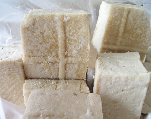 終於等到豆腐角上市了。台北的傳統雜貨店還願意賣這個,真是太令人感動~ 老闆說,買回家如果不馬上製作,要放冰箱保存,不然豆腐角裡的鹽分會一直析出。這家雜貨店的豆腐角算個賣的,一個4.5元,大小約為 長4CM x 寬3.5CM x 高2.5CM。