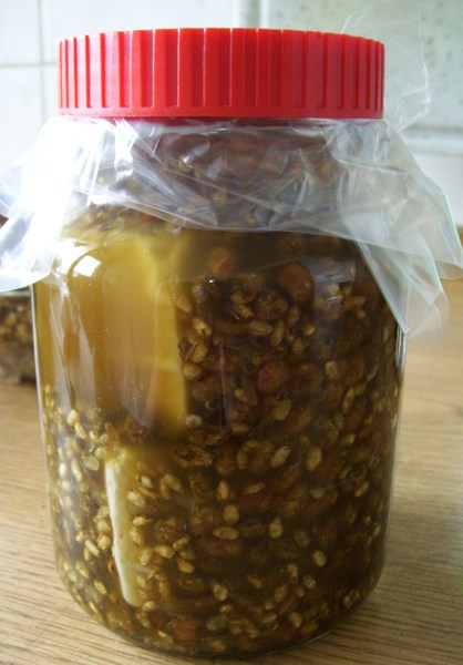 倒入米酒,蓋上塑膠袋+瓶蓋密封。豆腐乳睡覺的時間到了,要變成好吃的豆腐乳喔~~ 四個月後再見!