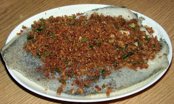4. 除去蒸魚的蔥薑片,鋪上豆酥即可。