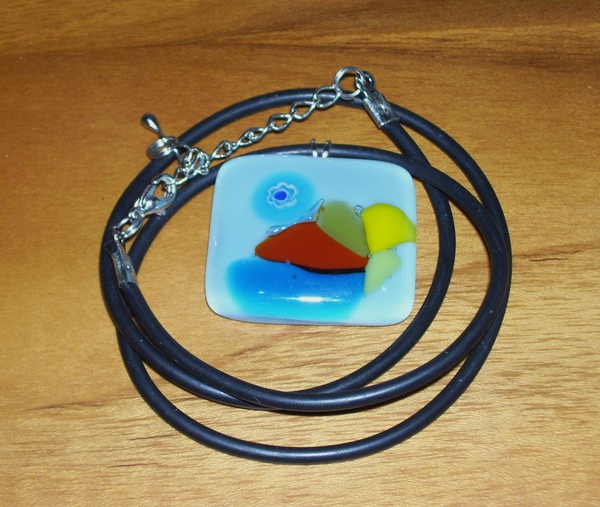 大致上就是取兩片約一吋見方的玻璃片,中間任意夾上彩色玻璃碎片或是老師已經燒好的小花片,用膠水固定後,在草圖紙上標示鍊頭要放在哪裡,老師會幫你黏上,之後就可以進爐燒了。材料的邊角原本是尖尖刺刺的,燒製時玻璃片會軟化,上層和中間的夾心以及底層就會緊密貼合,變成光滑的成品。也可選擇做成鑰匙圈(話說這一掉地上不就毀了嗎??)。