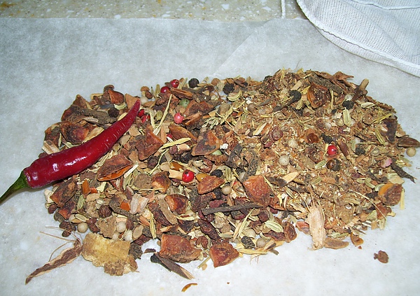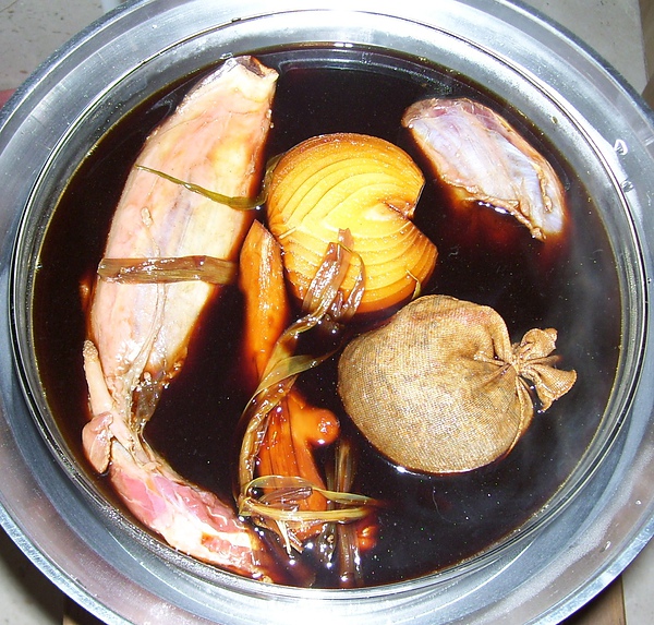 滷包是購自中藥店的現成品,據說可以滷3~5斤的肉。內容物有大小茴香、肉桂、陳皮、八角、白胡椒粒,另外自己加了約2小匙的彩色胡椒粒和一小根辣椒。