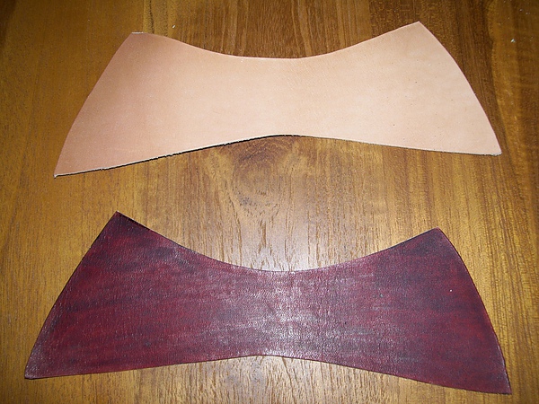 現成鞋面還得去觀光區的木屐店才買得到,不如自己買皮料徹底滴埃歪。厚度約有1.5mm,原色牛皮。皮面就照第三代的依樣畫葫蘆剪出來,再上咖啡色染料。材料店老闆建議噴上亮油,比較不會掉色。