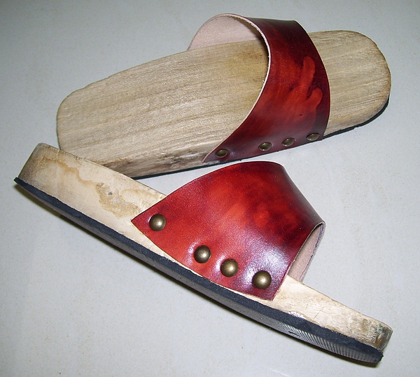 但也不知是我噴的技術不好還是怎麼的,油一噴上去,染好的顏色反倒是溶出來,變得不均勻@@。 不管啦,反正還是可以穿就無妨。打上釘扣店買到銅色木屐釘,完工!