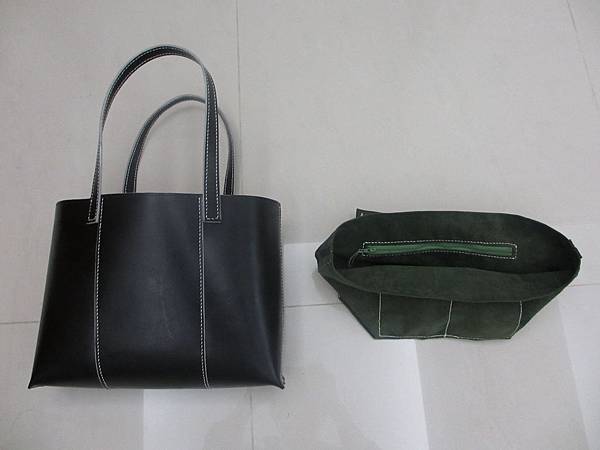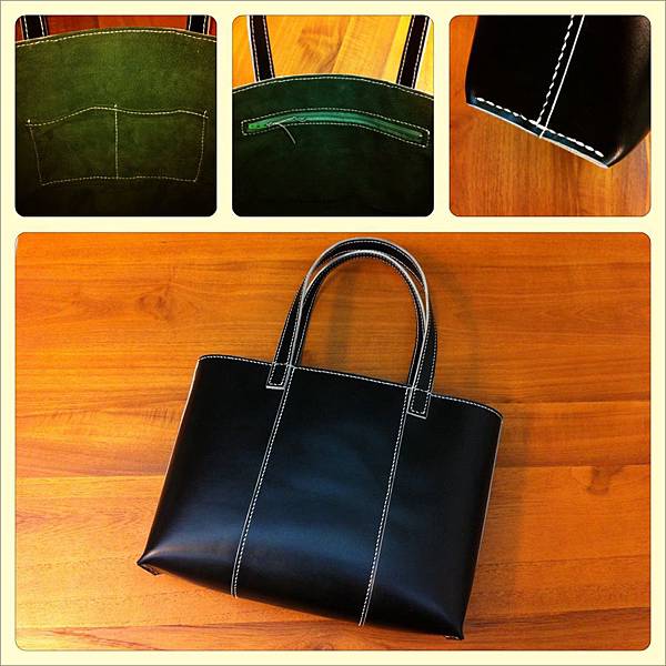 原來沒有的內裡,這次自己用綠色的豬皮加上了,內袋和拉鍊暗袋是一定要的。縫合前後各上了一次牛腳油,包身變得柔軟了些。最後再上一層貂油,防水防污。