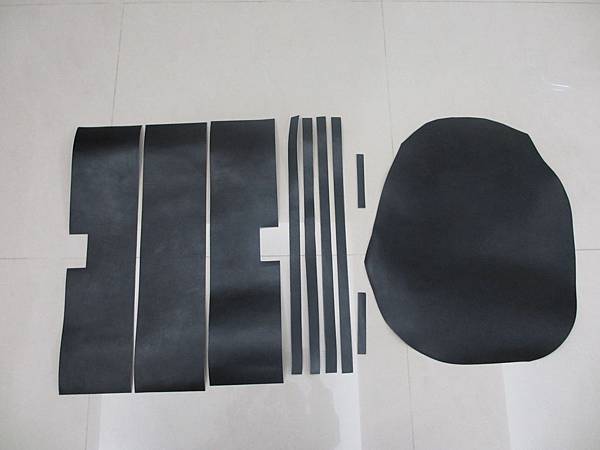 裁好的零件,最小的兩片長條後來沒用上,右邊是皮料原型,這片長度稍嫌不夠所以不用在這個包上。
