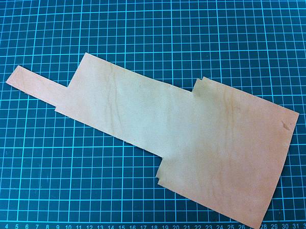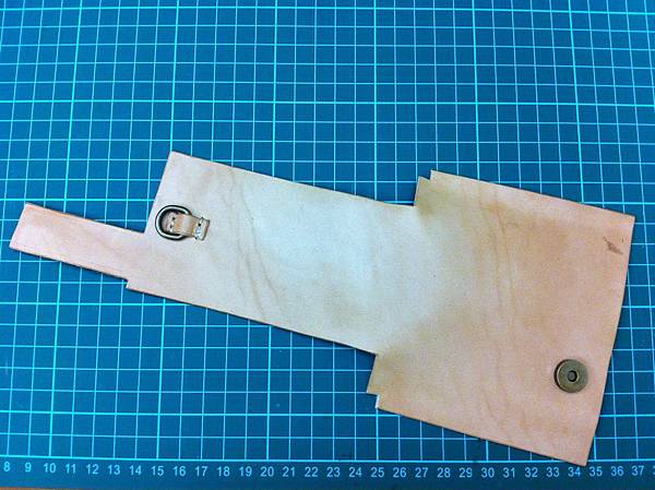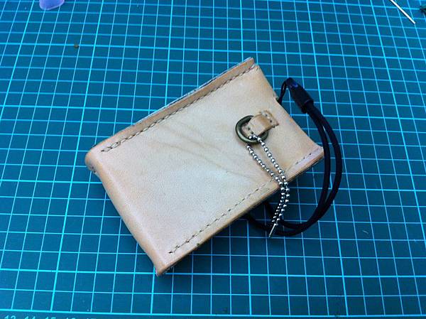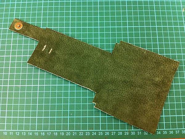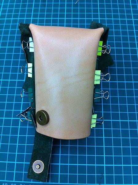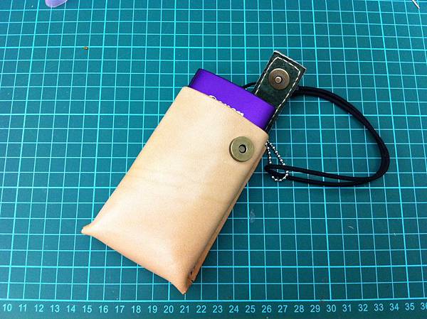 量好尺寸用紙板先做了版型,面皮用原色牛皮,部位是一般比較不偏好的腹部,但那花紋其實蠻有趣的。 五金用古銅色的磁扣+D型環。 內裡貼綠色豬皮。費了點工夫黏合。 衣可蔽體我就當它是成功了! 成品的尺寸約是10CM x 6CM x 2.5CM。 背面另加一條珠鍊把相機和包綁在一起,以免掉了。