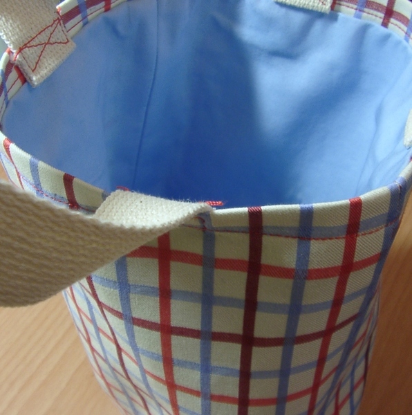 翻翻我的布堆.....嗯,這塊不錯。米色底+三色格紋織花布料,顏色有點低調但又不是太低調。搭配素面水藍色內裡和米色織帶,完成品尺寸約為20x5x26公分,無暗袋。